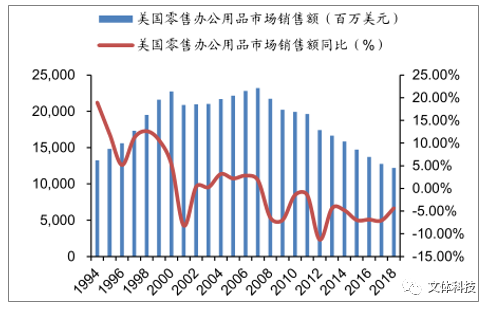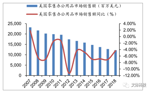 无纸化办公冲击传统文具品类需求,电商渠道崛起,线下零售业务遭重创。受无纸化办公持续影响,北美打印与书写纸张需求量2011年起进入负增长阶段。与此同时电商崛起也使得传统C端零售业务遭遇重创,2018年零售办公用品销售额较2007年下滑47.41%,其冲击一方面来源于办公用品高标准性的特点,电商渠道储货、备货无需过度复杂空间,另一方面,电商采购时效性与便利性更强,丰富的品类优势满足一站式购物需求,冲击传统零售业务。