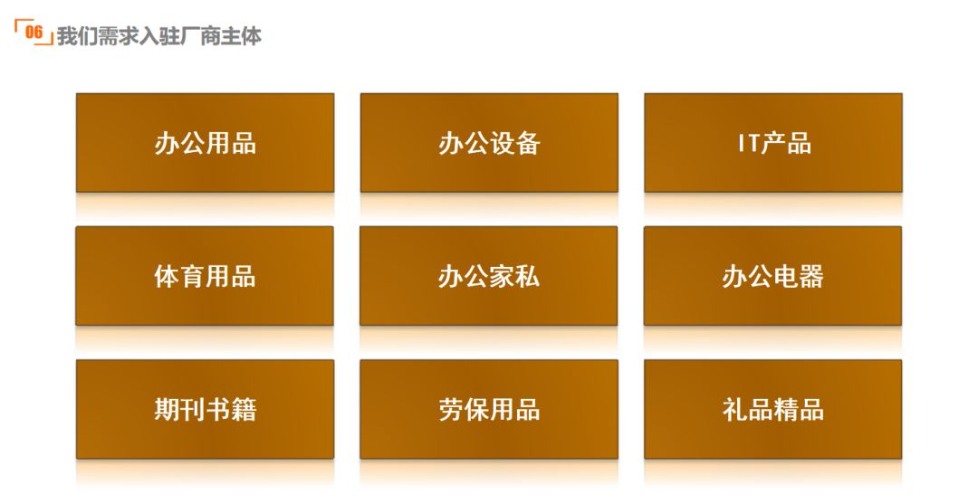 平台成立于2013年,自创立至今,从简单的办公用品销售,拓展到体育用品、办公设备、办公耗材、办公家具、IT设备、劳保用品、书刊、礼品精品等十五大类,会员辐射各大高校、企业、机关事业单位及个人。