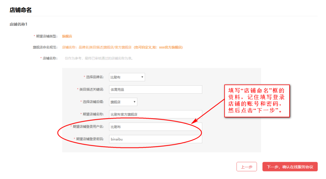 5-7、填写“店铺命名”框的资料,记住所填写的账号密码。